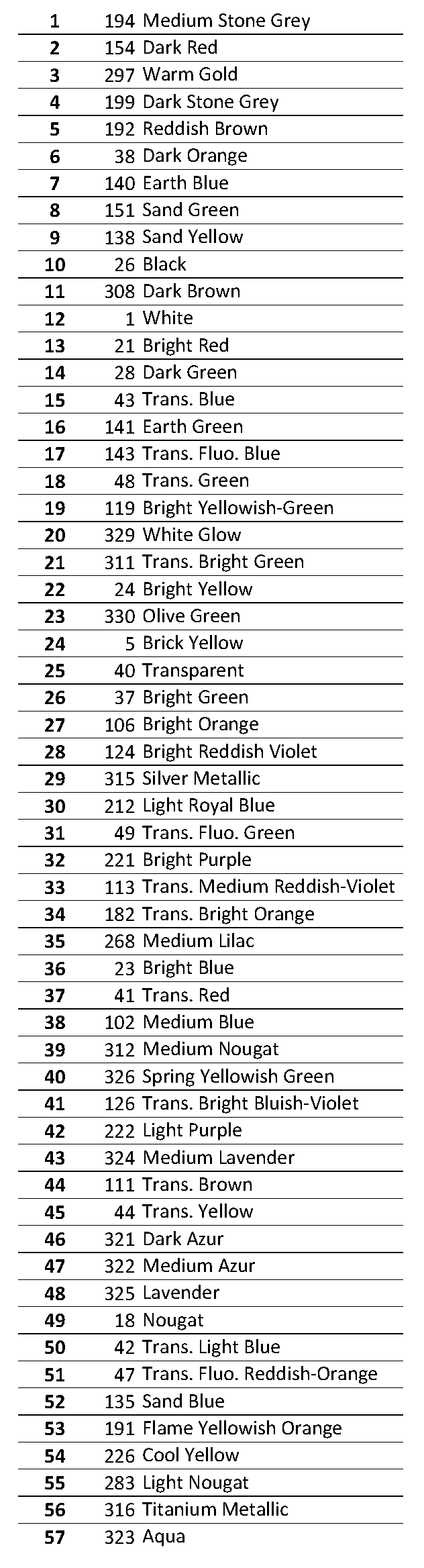 Beaucoup ayant des difficultés avec le fichier Excel de Lego je vous propose une version très allégée. j'ai supprimé les refs doublons a cause des couleurs, les Duplo, et le minifigs puisqu'elles ont leur propre stand d'assemblage.