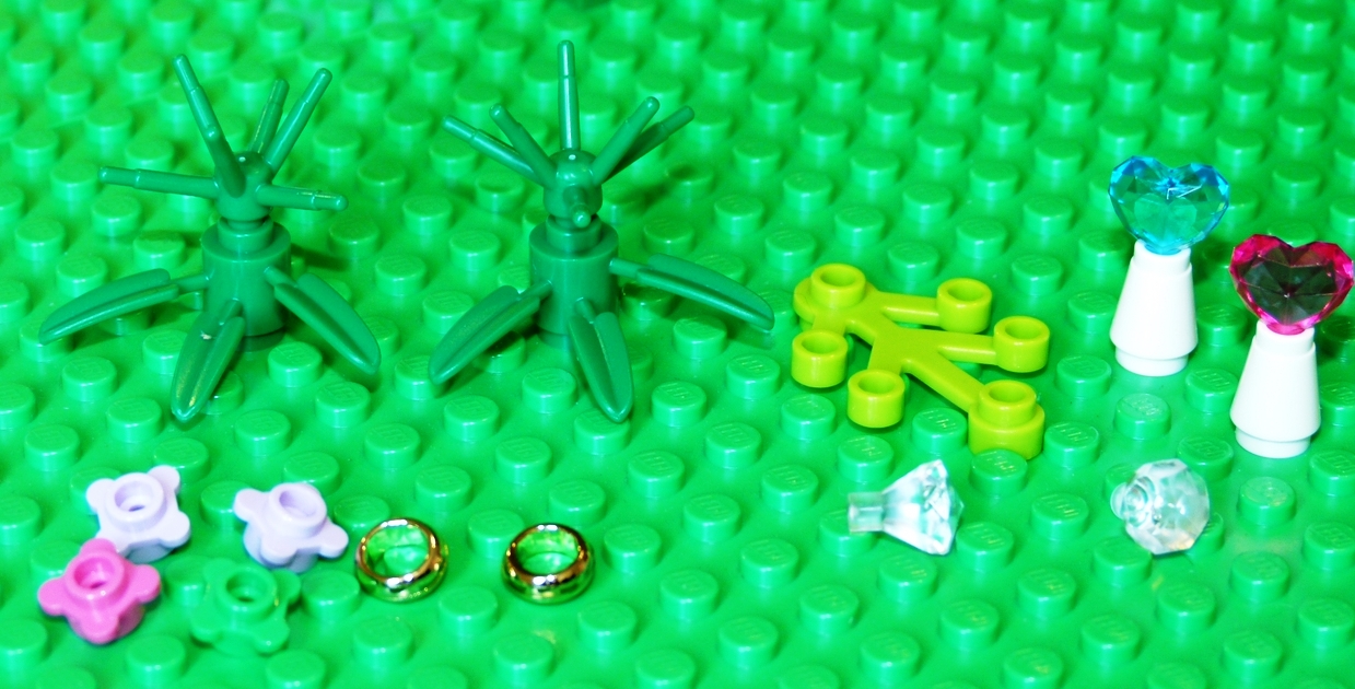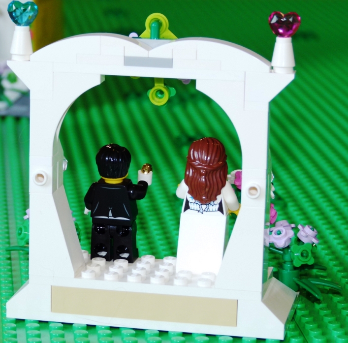 La mariée... comment ne pas montrer ma déception? il y a comme le marié 3 perruques et... et c'est tout, pas d'autre têtes. Et la robe, hum, j'ai du mal à trouver les mots. Le bas de la robe n'est pas raccord avec le haut, on aurais pu avoir une brique sérigraphiée. De plus le dos de la robe et le devant ne sont pas similaire dans le bas, la couleur n'est pas la même, mais ce n'est pas si important car une fois les cheveux en place on ne voie plus le dos de la minifig... Les petits accessoires sont sympa avec des pièces assez rares comme les 2 cœurs en cristal. Une impression qu'un des anneaux est de couleur plus foncé que les autres, mais pas réussis a mettre en évidence cette différence en photo. Les étape d'assemble sont très simple et rapide. Apres montage il reste pas mal d'extra parts notamment les perruques et une tête de minifig Le rendu final est très sympa, le petit autel est fidèle à ce que sont les autels de plein air que l'on voit souvent dans les film américain. Les différente têtes et perruques permettent pas mal de possibilité et le gros bouquet de fleur de la mariée masque la robe pour ne pas voir la misère de celle-ci.