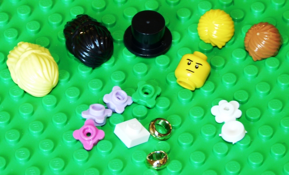 Je ne parlerais pas de prix à la pièce (ppp) car il y a des accessoires de minifig en quantité. Le contenu de la boite, 2 sacs, 2 plaques blanche et une notice. Le Marié, recyclage du torse du pingouin (Batman) ce qui donne un aspect serré dans sa veste au marié, on aurait pu avoir quelques détails sur le pantalon mais passons. Nous avons 2 têtes dont une avec 2 impressions, 3 perruques et un haut de forme.