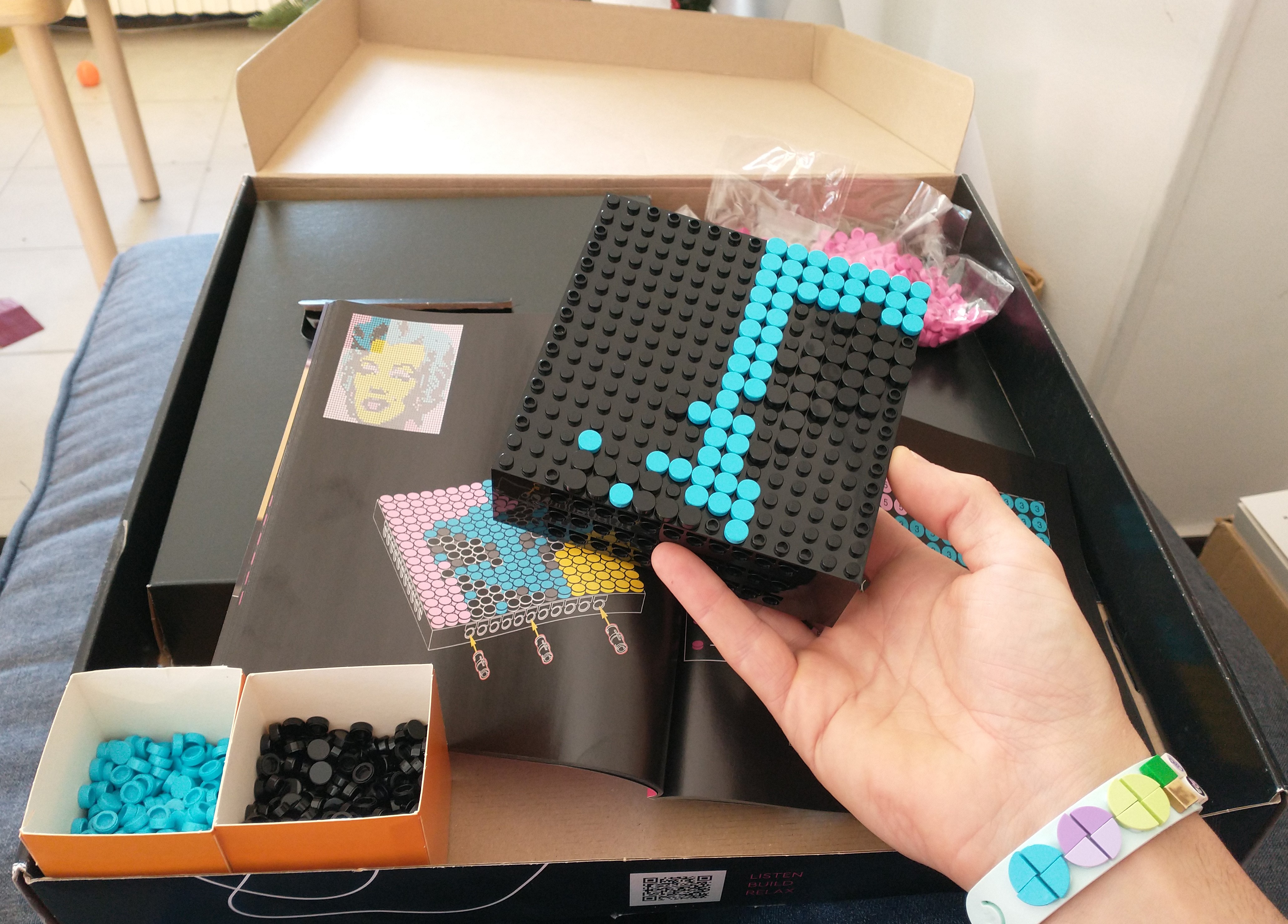 Assemblage aisé sur la méridienne du canapé, la plaque dans une main, piochage et pose des tiles de l'autre, tranquille, en écoutant The Dandy Warhols