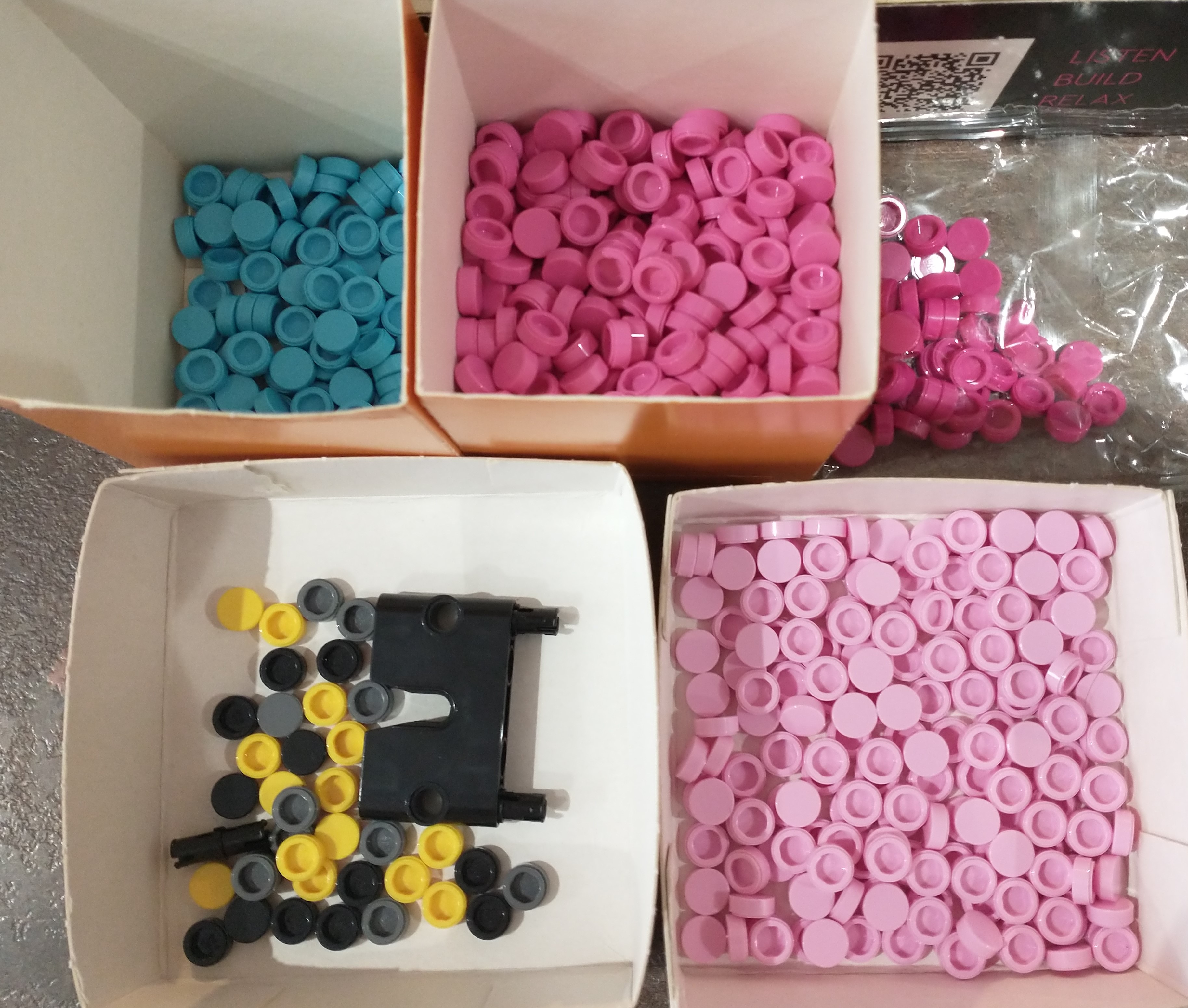 Pièces restantes, j'ai pas compté, un gros tas de rose moyen (petit sachet de rose foncé non entamé pour ce modèle) et la deuxième pièce pour la fixation murale n'est pas essentielle.