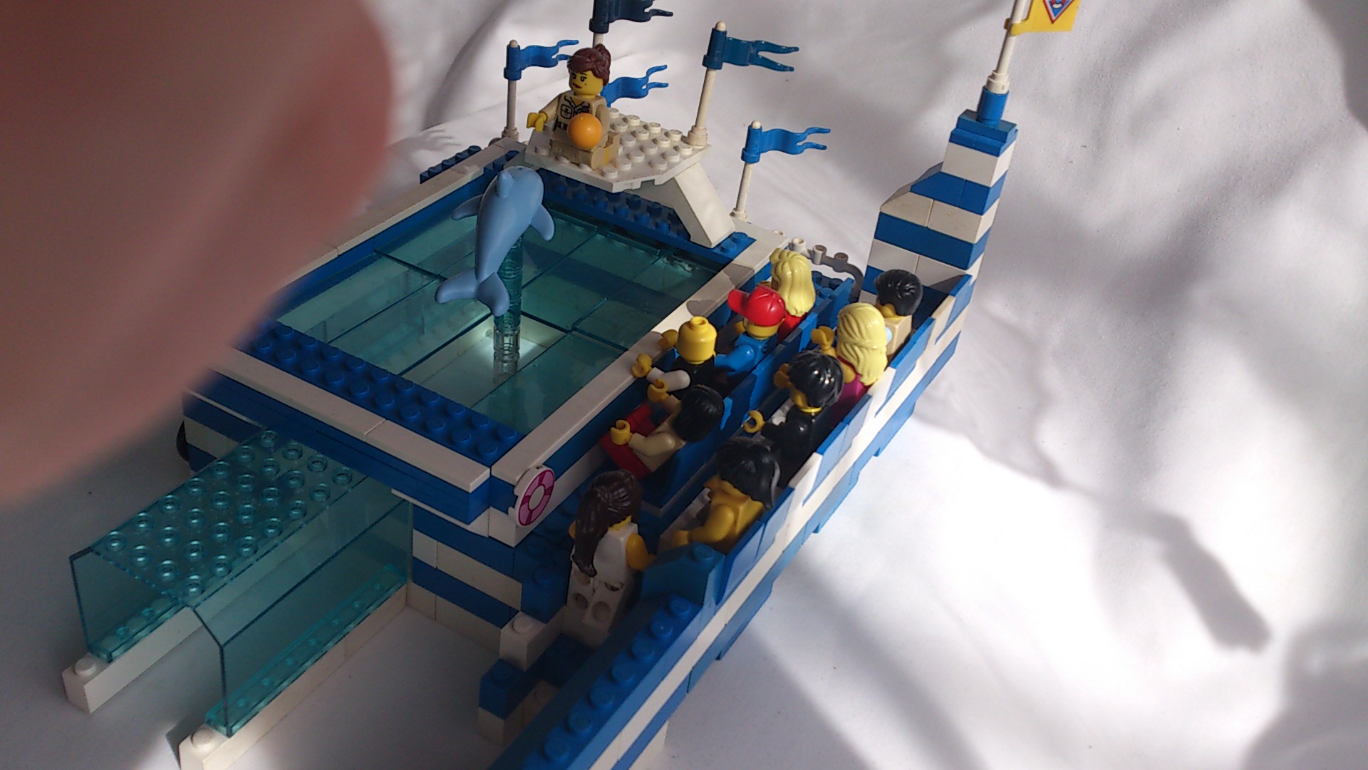 J'ai prévu d’ailleurs qu'un dauphin se jetterai hors de l'eau pour toucher la main du dresseur.