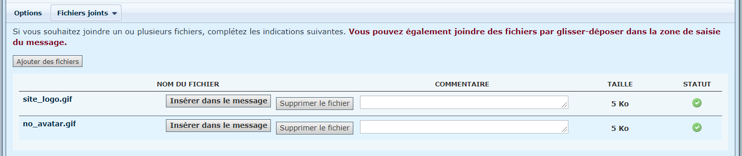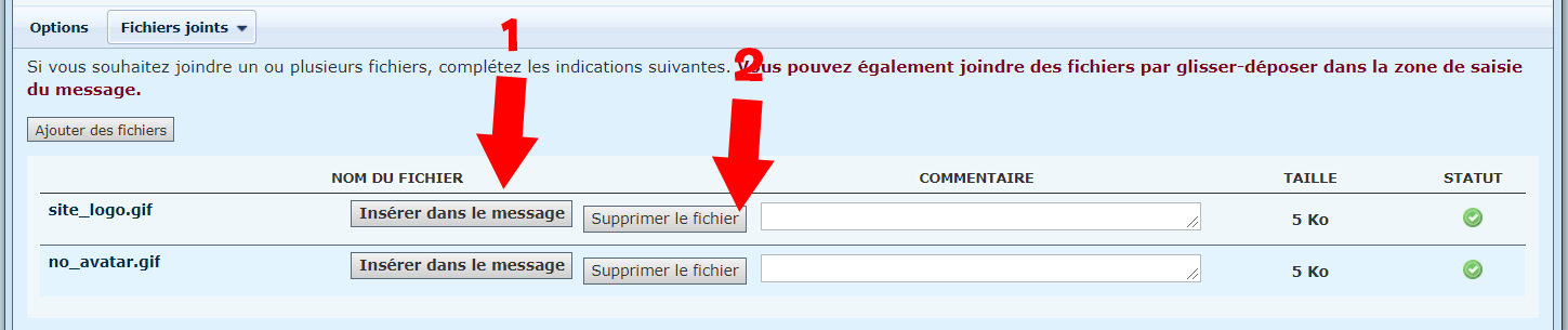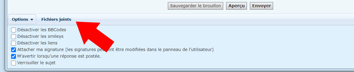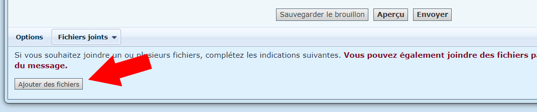 1 - Sur la page de rédaction du message, en dessous du bouton "Envoyer", vous avez un onglet "Fichiers joints. Cliquez dessus