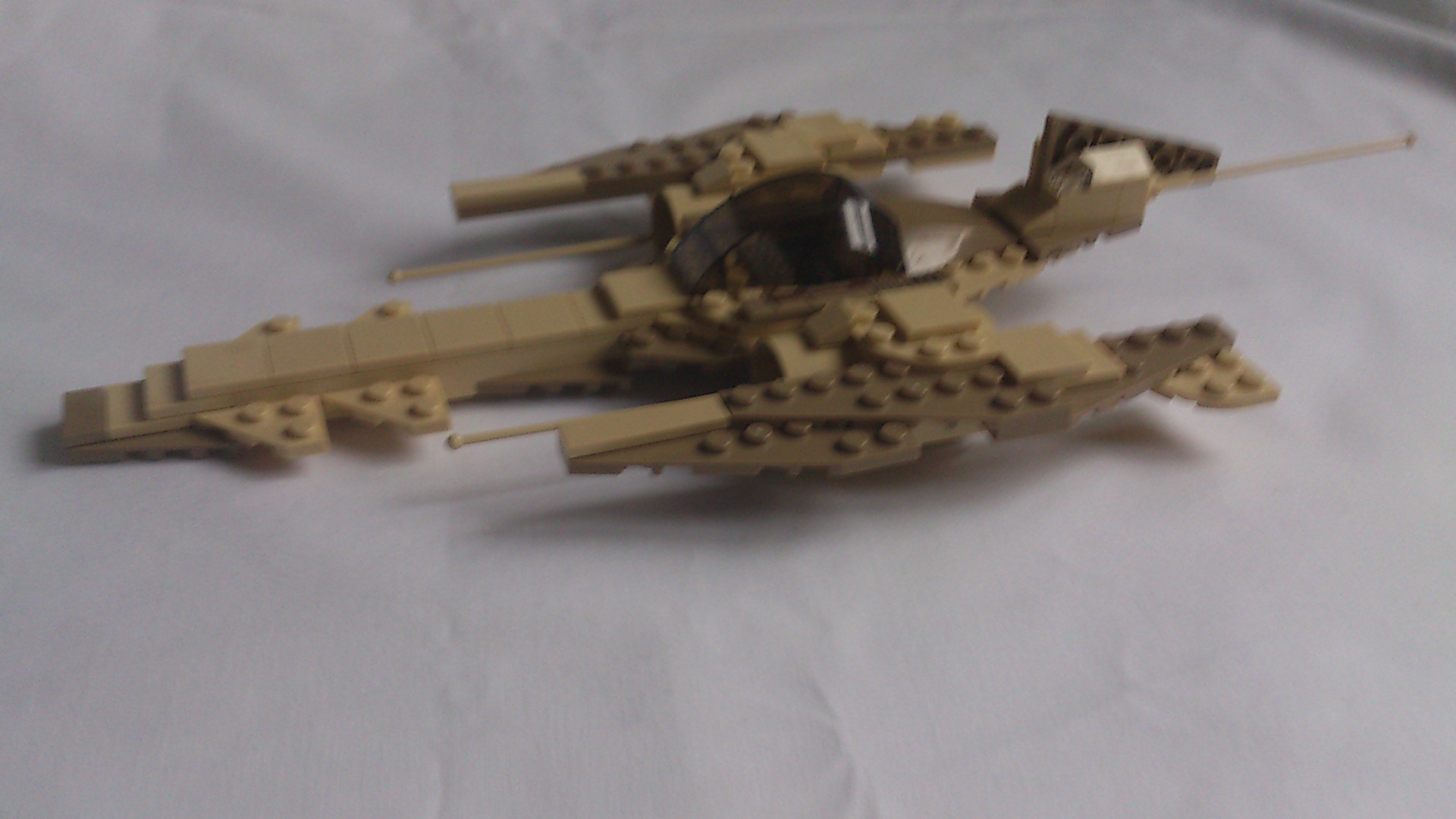Par contre si tu veux le considérer comme un VicViper à part entière, quelques petits aménagement seraient nécessaires : la partie centrale de l'avant devrait être plus courte que les deux parties latérales avec les grosse pièces de camion. Il ne faudrait qu'un aileron au lieu de 2 sur le haut. Et les ailerons de côté devraient être un peu plus large (peut-être les placer simplement dans l'autre sens). Mais bon, ça c'est vraiment si tu veux que ce soit un VV, sinon en tant que vaisseau il est plutôt réussi en lui-même.