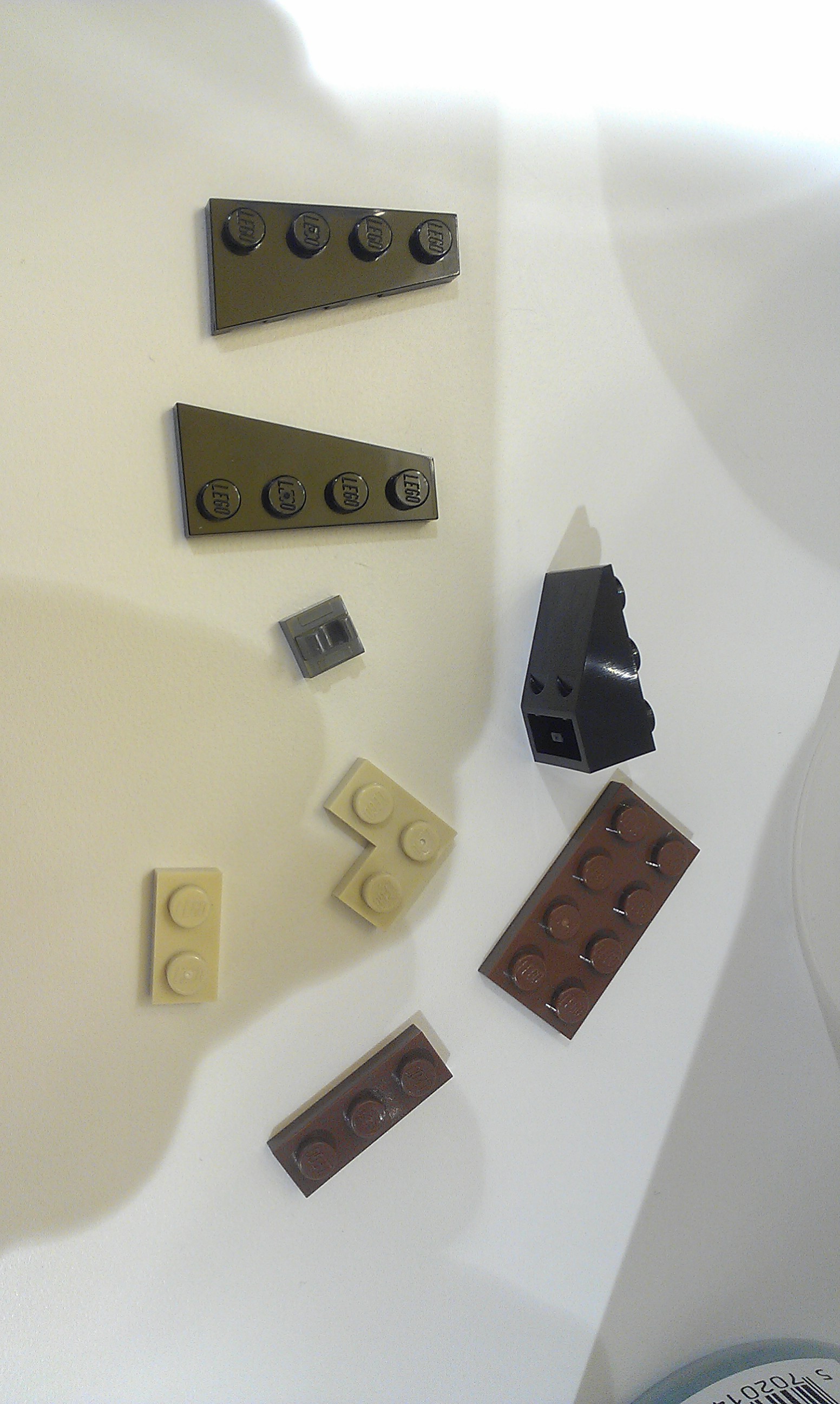 - des tiles (plates lisses) 2 x 2 en gris clair, 1 x 2 en rose clair, 1 x 4 en marron,