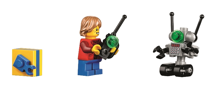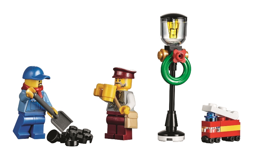 • De nombreux éléments d’accessoires comprennent des couronnes vertes, des lumières décoratives, des branchages blanc, ainsi que des paquets cadeaux et des petit jouets en briques, dont un micro train, une voiture à ressort, un camion de pompiers, un robot télécommandé, un voilier et un vaisseau spatial.