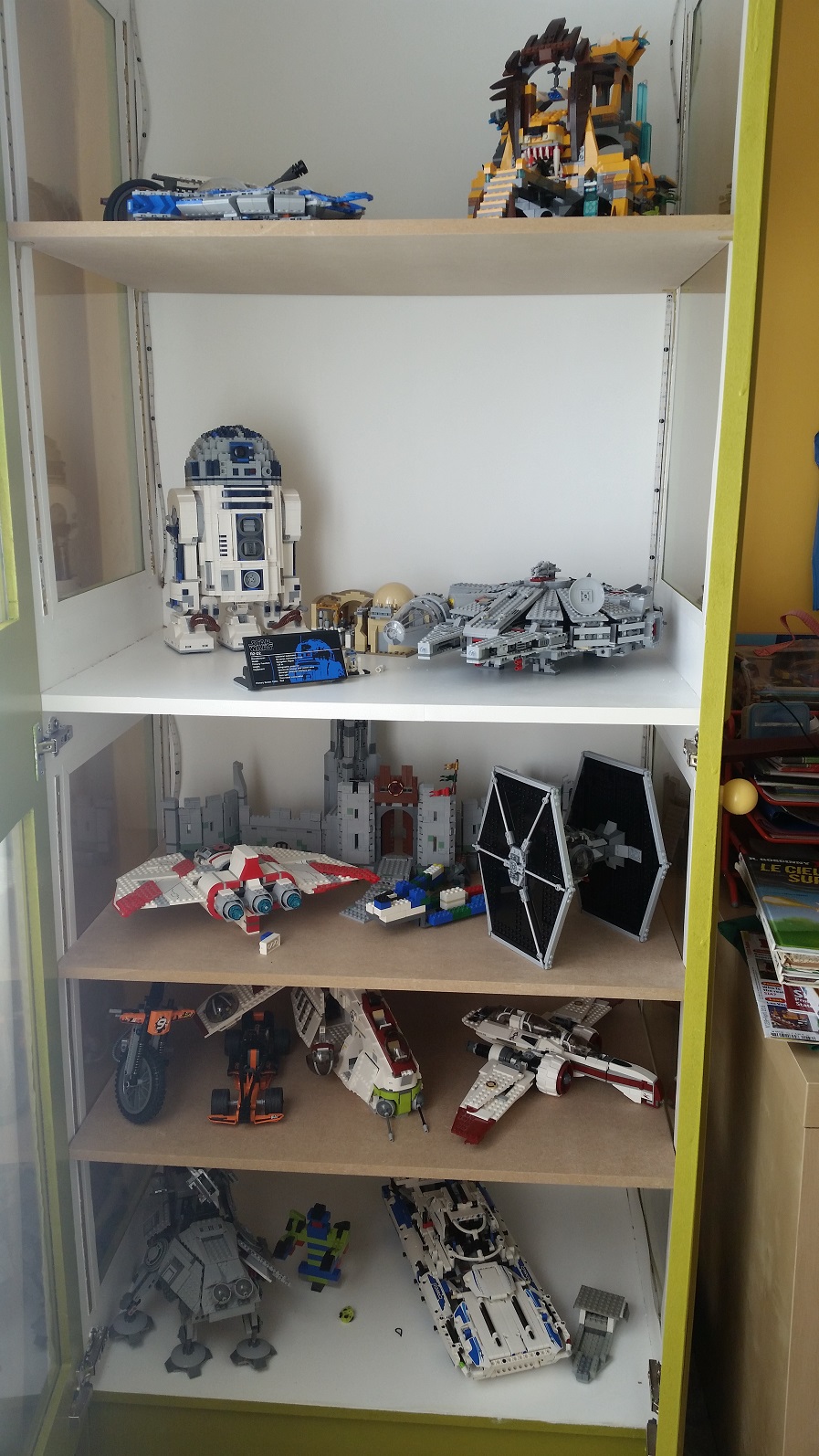 Comme sa passion prend de la place, je lui ai construit une armoire (à la taille de 3*2 plaques par étagère) et une table de jeux (à la taille de 6*4 plaques) pour lui ranger (on peut toujours réver), présenter et jouer avec ses legos dont j'ai gardé presque toutes les boites.