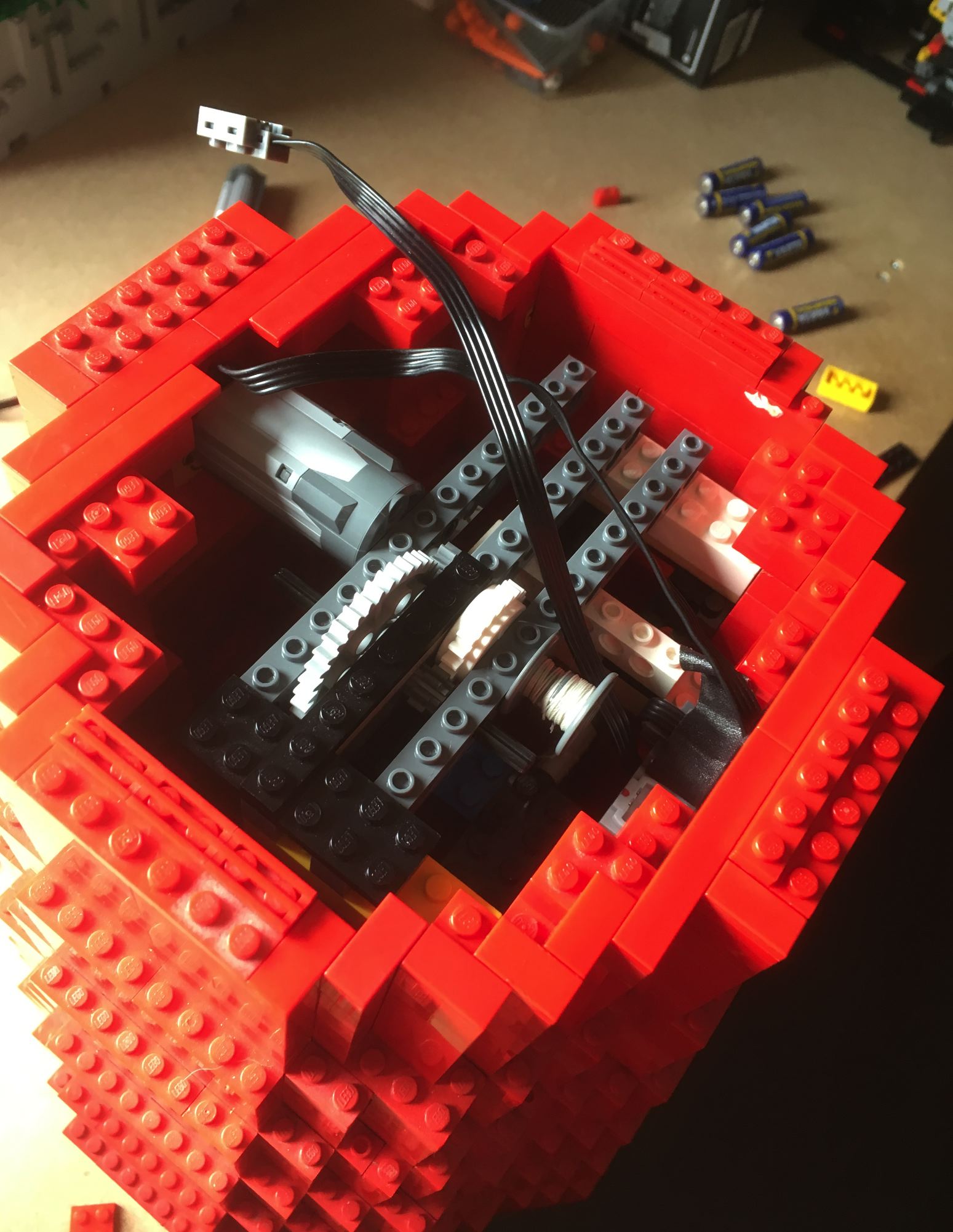 - Installation d'un limiteur de couple sur le système de descente et de remonté de l'échelle (limiteur de couple = pignon Blanc de chez Lego qui patine en cas de blocage de l'axe et évité toute casse)