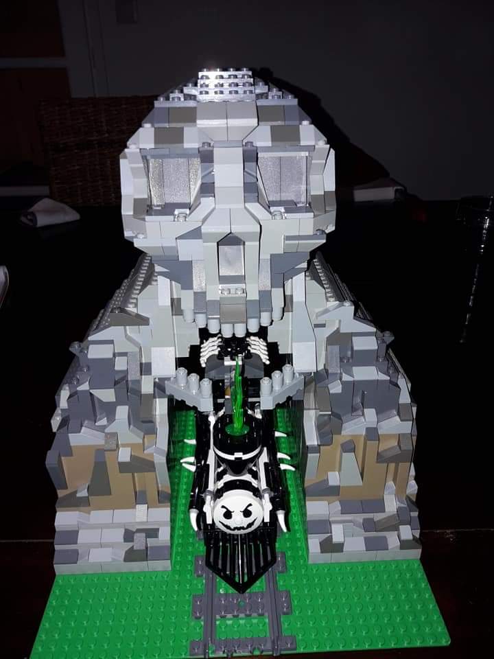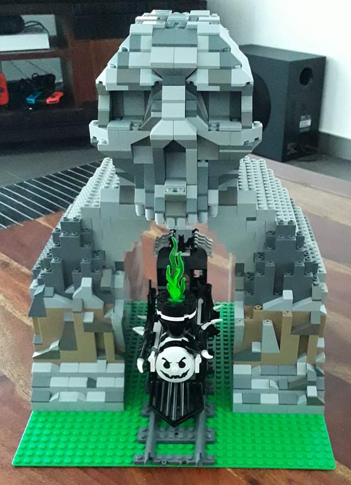 Le train sortant par la bouche ouverte. J'ai donc besoin de conseils ou d'aides pour m'aider à concrétiser ce projet, si possible à la prochaine Chti Brick. Je vais vois pour avoir des briques grises claires et foncées. Mais l'idée est de refaire une sorte de montagne qui partirait du cimetière. Dans la suite, rajouter 3 plaques 32x32 pour incorporer une cascade qui amènerait vers le old fisher shop avec une un marais pour la créature.