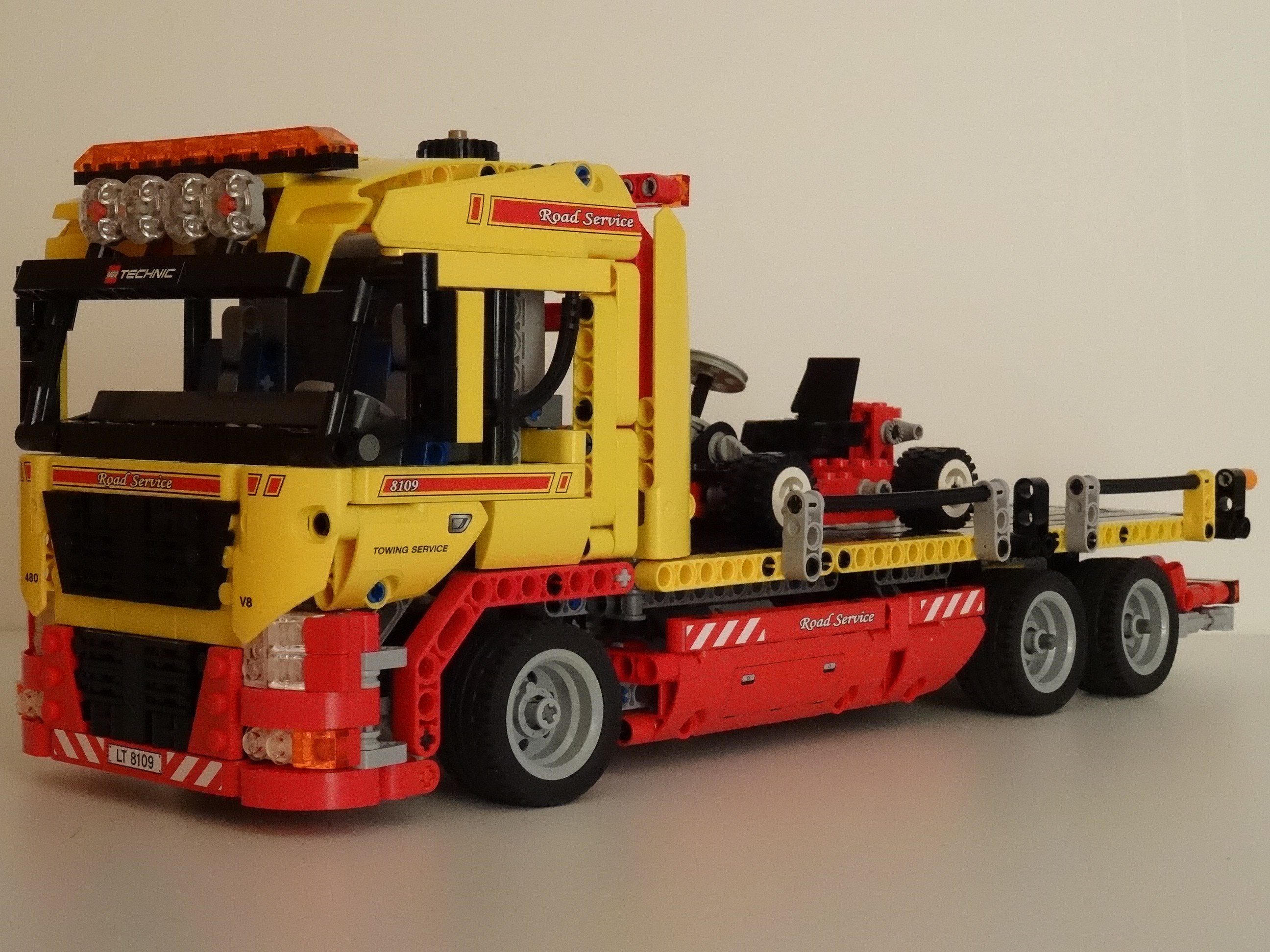 Activer les fonctions LEGO Power Functions pour déplier les stabilisateurs arrière ou déplier et soulever le bras de la grue totalement ajustable et le mettre en position. Abaisser le crochet avec le treuil , déployer le mécanisme de soulèvement à l'arrière et charge un véhicule à remorquer.