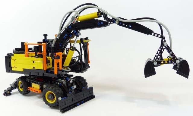 Utilise les leviers pour articuler le bras, soulève et abaisse la pince, fais tourner la superstructure et conduis les énormes chenilles pour manoeuvrer cette énorme machine !