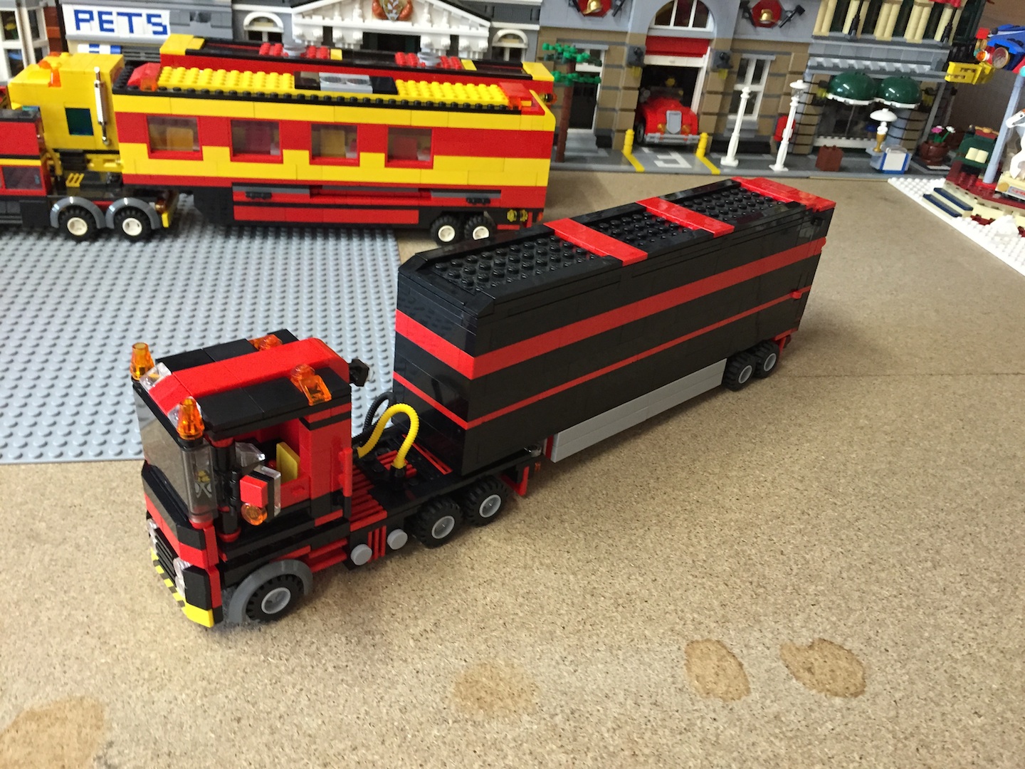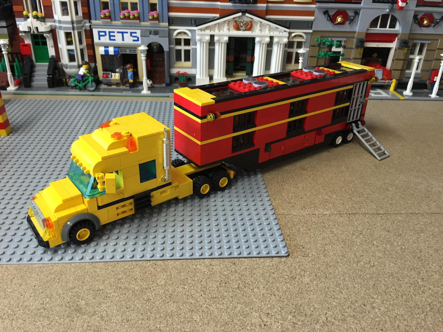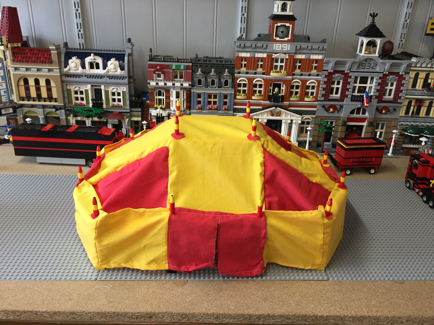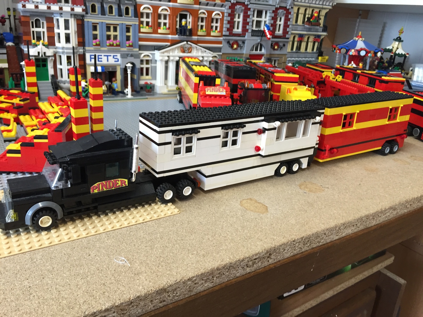 voila mon moc assez bien entamé déjà j'avais dans l'idée de réaliser un cirque depuis longtemps mais par manque d'inspiration j'avai mis cette idées de cote que j'ai repris il y a pas si longtemps j'ai donc réaliser ce cirque avec la contrainte de pouvoir tout mettre et ranger sur semi-remorque comme un vrai.
