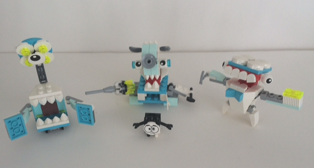 Vue des 03 monstres ensemble avec le petit nixels qui a les oreilles en feu ( petit point positif encore de chez lego) :