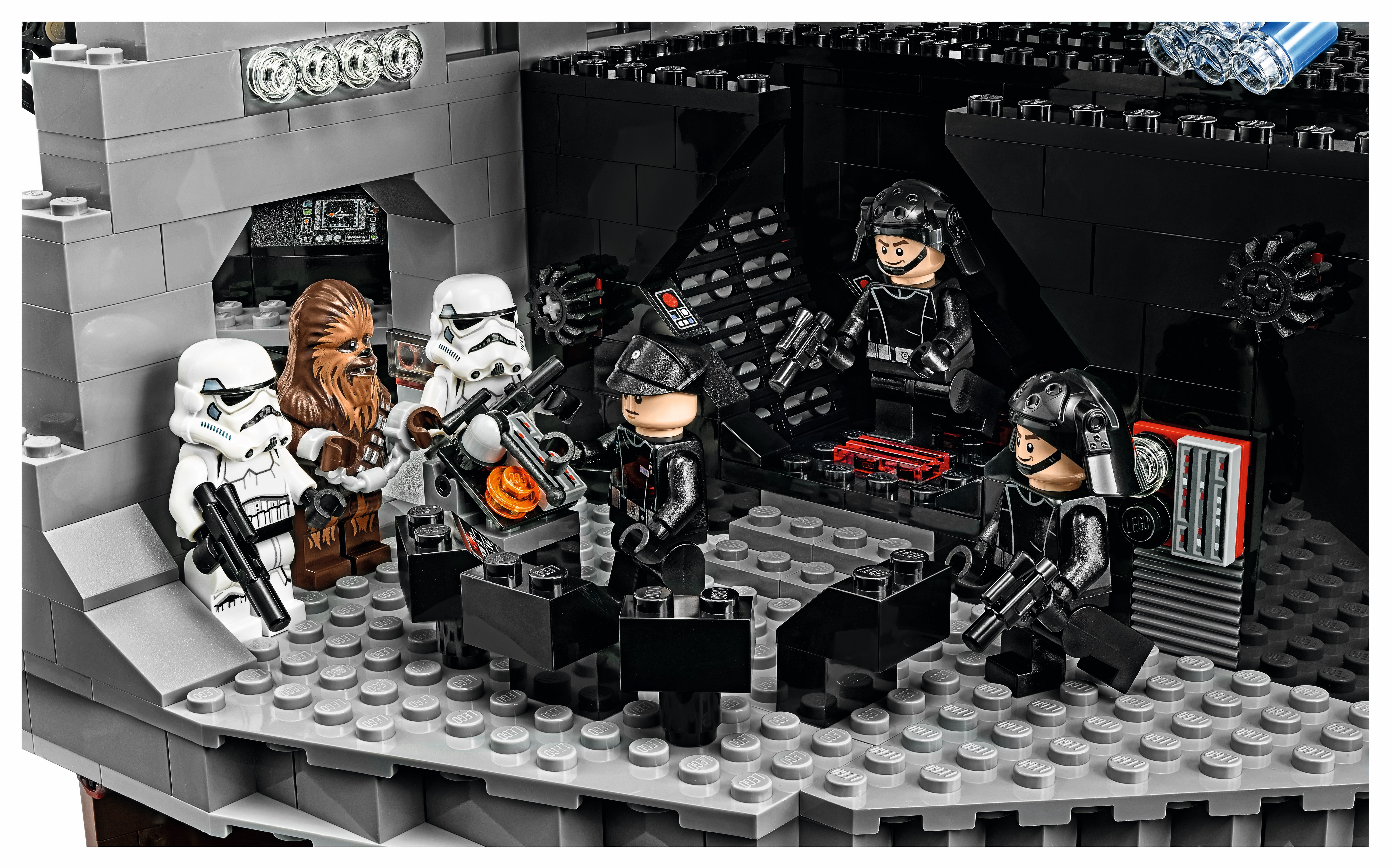 • Features a superlaser control room, Imperial conference chamber, hangar bay with moving launch rack and detachable TIE Advanced with space for Lord Vader inside, Emperor Palpatine’s throne room, Droid maintenance room, detention block, trash compactor, tractor beam, cargo area, turbo laser with spring-loaded shooters and seats for the 2 Death Star gunners, and 2 movable turbo laser towers.