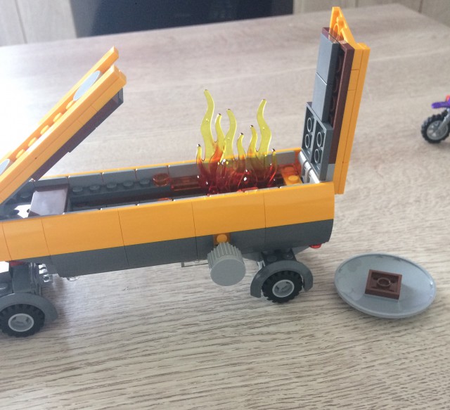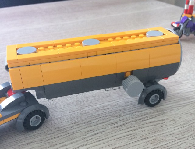 On continue avec le camion citerne. C'est une belle réussite tant au niveau de la jouabilité qu'au niveau de la conception. Le bas de caisse est très bas tout comme la cabine. C'est encore simple à construire mais la couleur jaune apporte un coté punchy. Au niveau jouabilité , on tourne la molette sur le coté de la citerne et on se retrouve avec le cul du camion qui tombe et des flammes qui apparaissent. C'est top