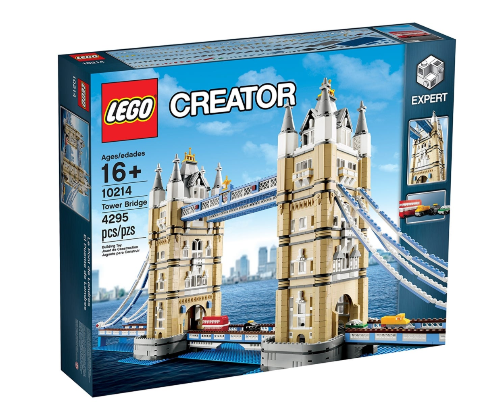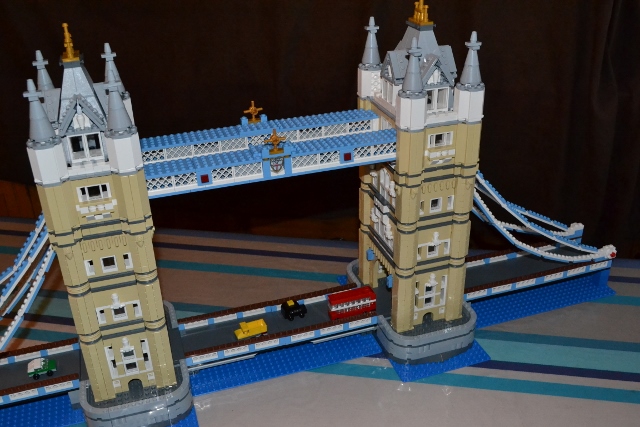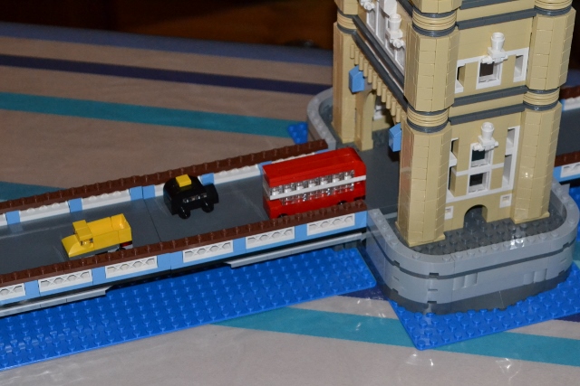 Ce set comprend 4 véhicules à l'échelle : un taxi londonien (noir), un bus à impérial, un camion jaune et une voiture verte. Le pont s'ouvre comme le vrai. Au total, il mesure 102 cm de long, 45 cm de haut et 26 cm de large. Une très belle pièce !