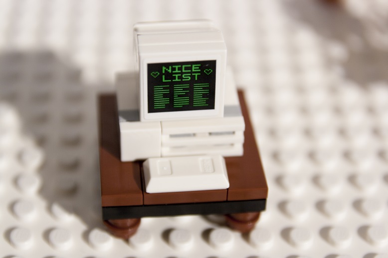 Autre accessoire, un ordinateur de bureau : je ne le vois pas comme un cadeau mais plutôt comme un outil de travail puisqu'il est présenté sur un bureau. Cela permet d'ailleurs de noter que le Père Noël s'appuie sur d'ancienne technologies. En effet, cet ordinateur de bureau, blanc, plat, surmonté de son écran cathodique monochrome vert et noir.