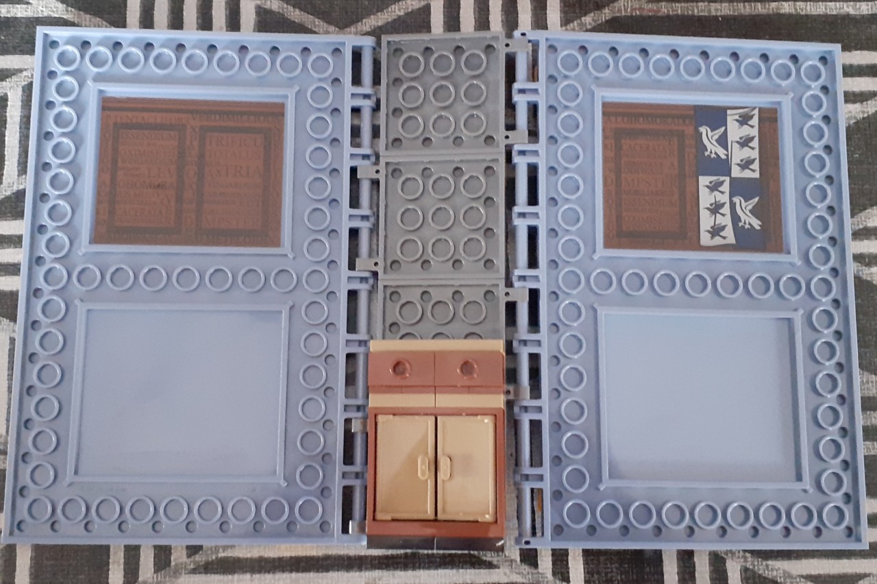 Pour le rangement, tous les meubles mobiles viennent se fixer à la structure de manière ingénieuse ce qui permet une exposition du livre fermé sans parties laissées sur le côté (hormis les figurines).