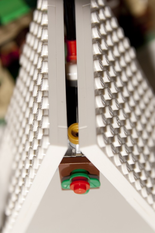 Pour relier chacun des pans un bloc est construit autour d'une brique lumineuse et de briques avec pinces 30237 qui se fixent de chaque côté sur les tiges 6L. La brique lumineuse peut être allumée via une bascule réalisée par un axe 6L monté sur une charnière et qui vient appuyer sur le bouton poussoir de la brique.