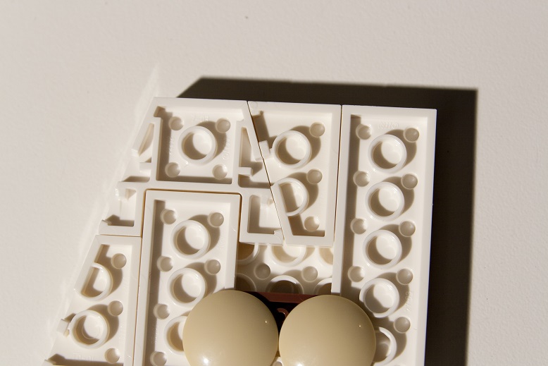 Ces deux petits toits sont construits avec une superposition de plaques, dont une aile 3x4 tronquée et évidée 48183. Ils sont fixés avec une plaque modifiée avec une tige 48336, et côté toit principal par une plaque modifiée avec deux pinces 60470.