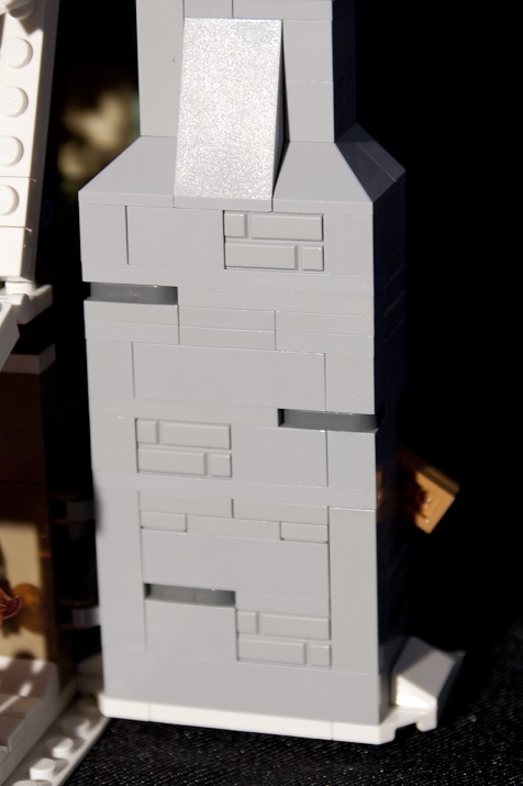 L’étape 5 concerne la cheminée et le four à gaufres. Le four et sa cheminée sont de couleur Light Bluish Gray avec quelques inclusions de Dark Bluish Gray, sont aussi utilisées des briques « mur » qui donnent à l’ensemble un beau rendu. Le foyer est muni d’une grille et d’une tile avec un tenon permettant d’y faire tenir une poêle (fournie) qui servira à chauffer les gaufres. Cette grille bascule vers l’avant afin de pouvoir récupérer le contenu de la poêle.