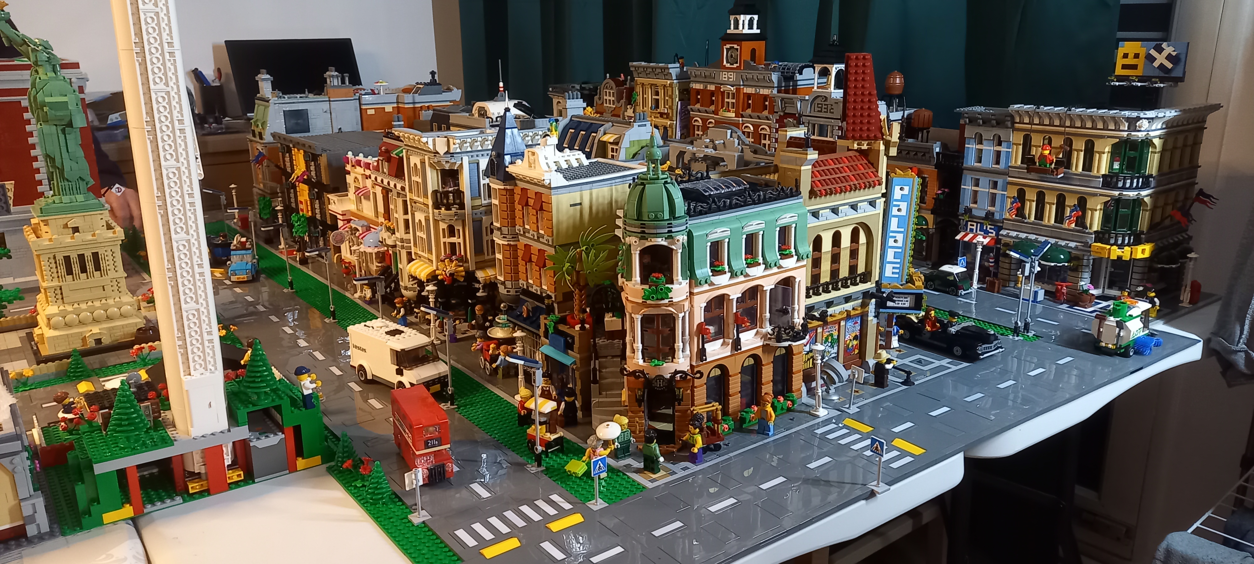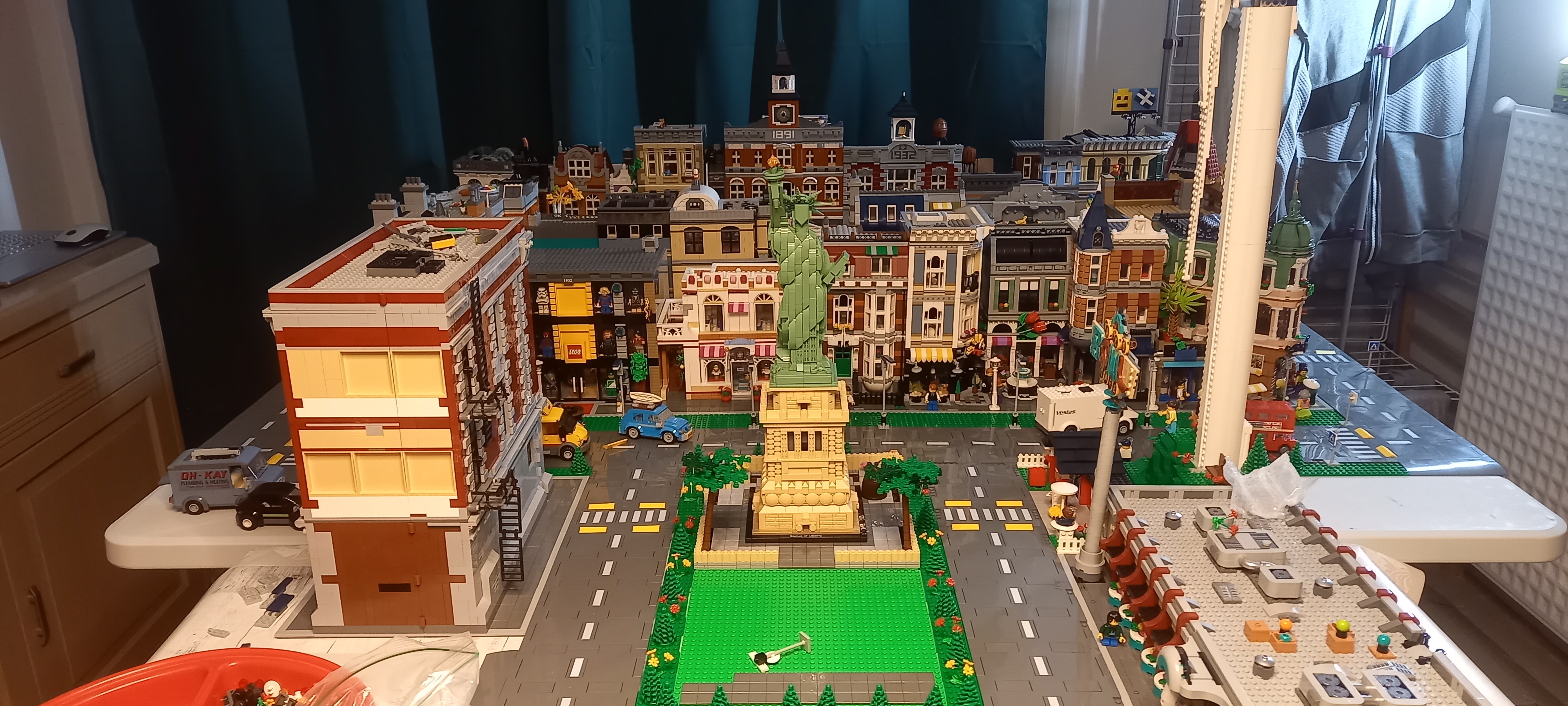 La mise en scène du Lego modular 2022 à complétement changé avec l'arrivé de mon Papa qui a eu plein d'idée et surtout voulu faire quelques chose de plus imposant. Prit au jeu, j'ai suivi et maintenant, ça ressemble a ça