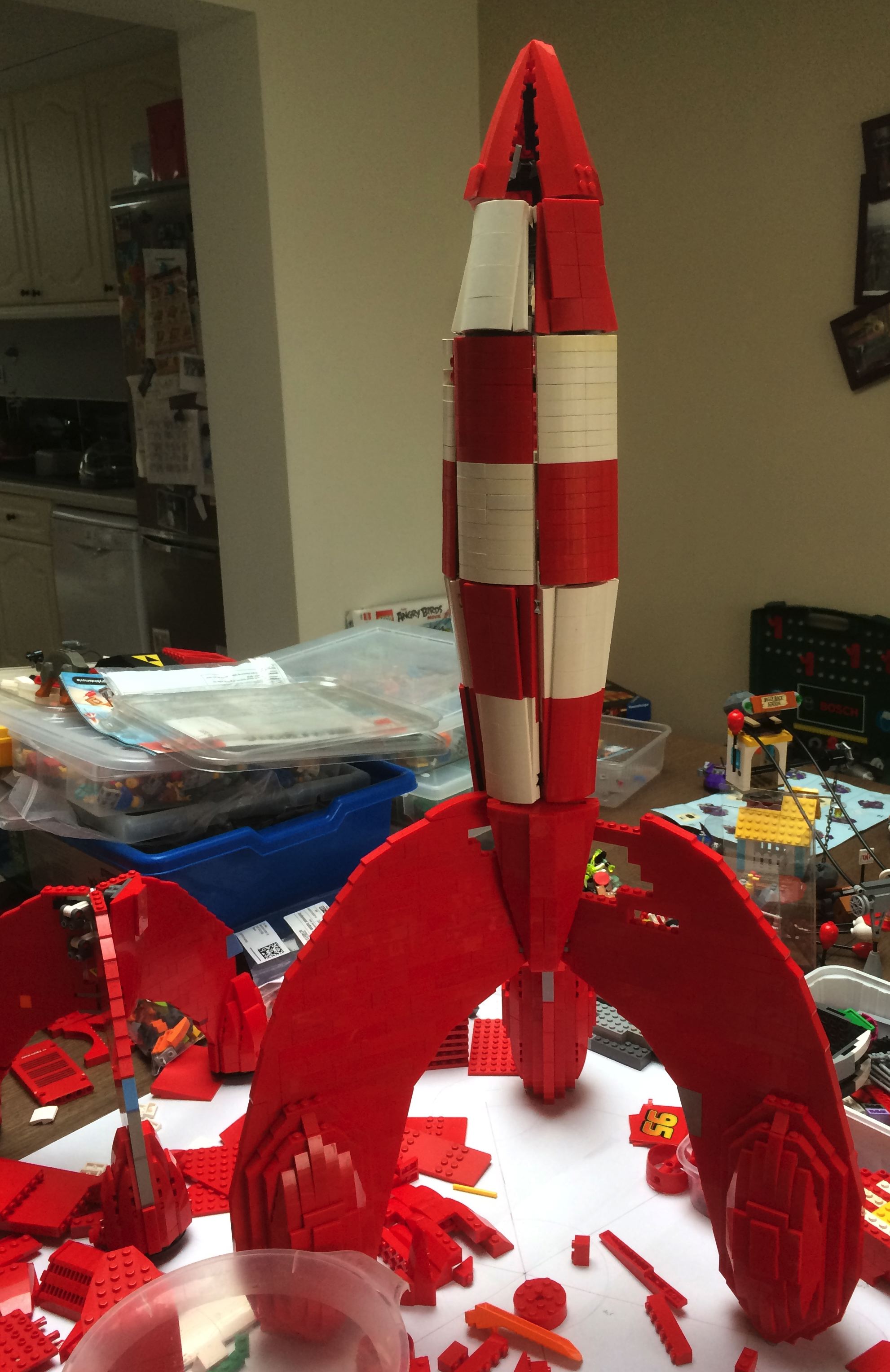 Voici une Photo pour vous présenter l'avancée de mon MOC TINTIN, la fusée a changé de taille (de 60cm de haut elle passe a presque 80cm), elle est plus grande et respecte plus les proportions comme dans la BD. Encore quelques Slopes curve rouge et Blanc et une ou deux modifications et elle sera prête pour cysoing...