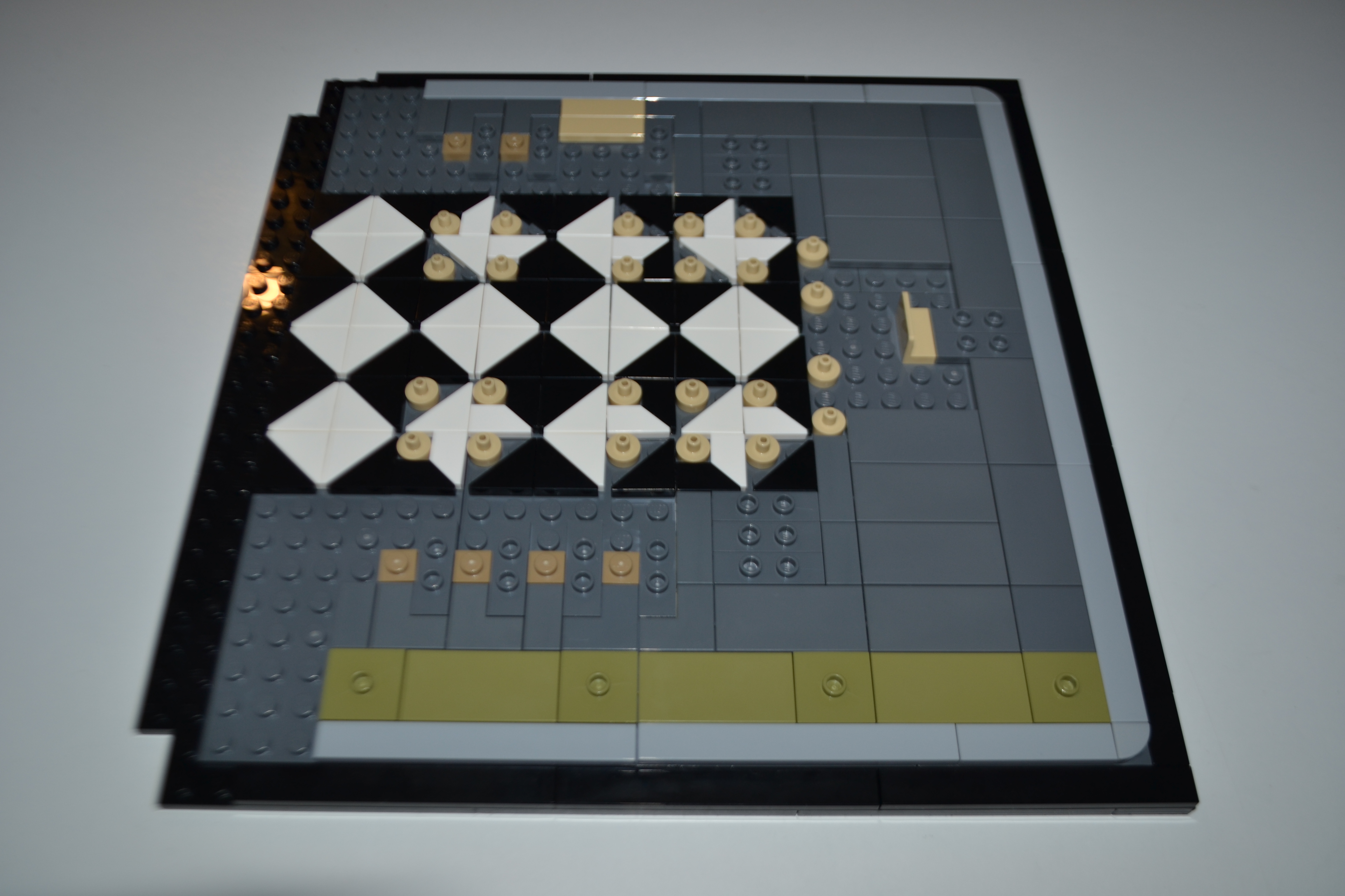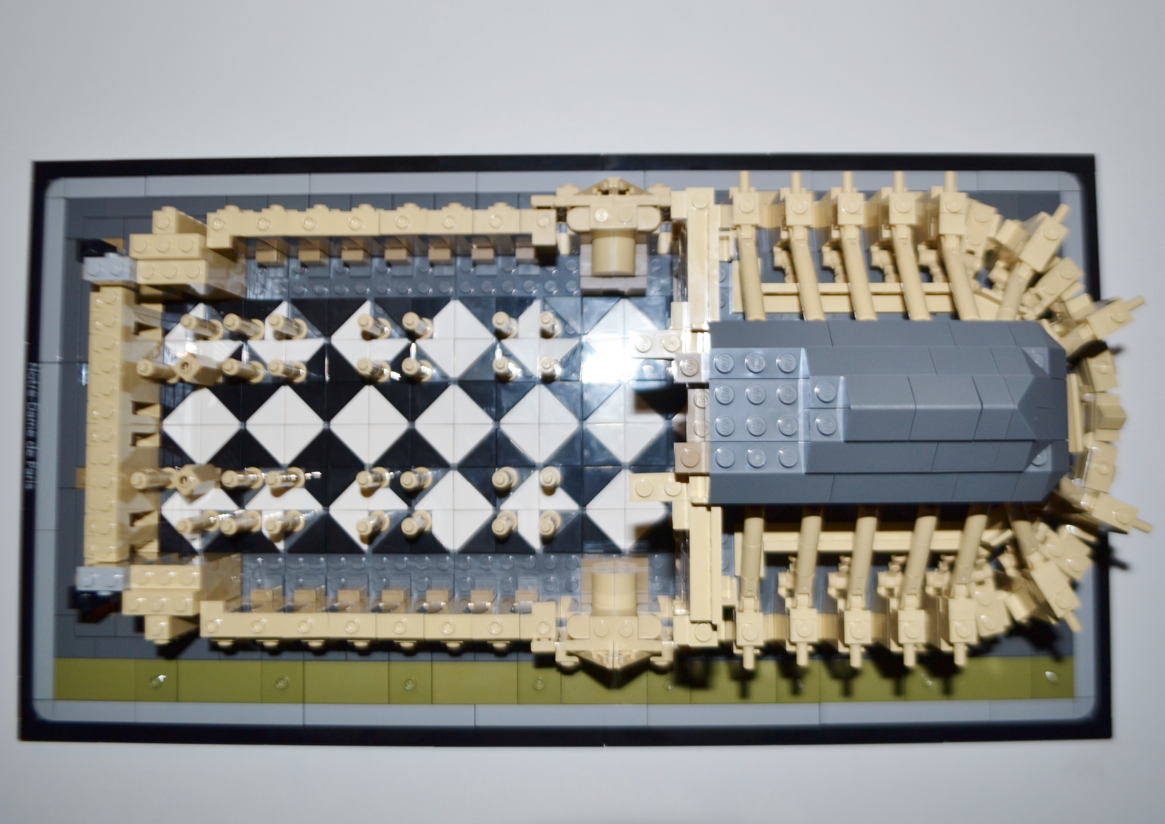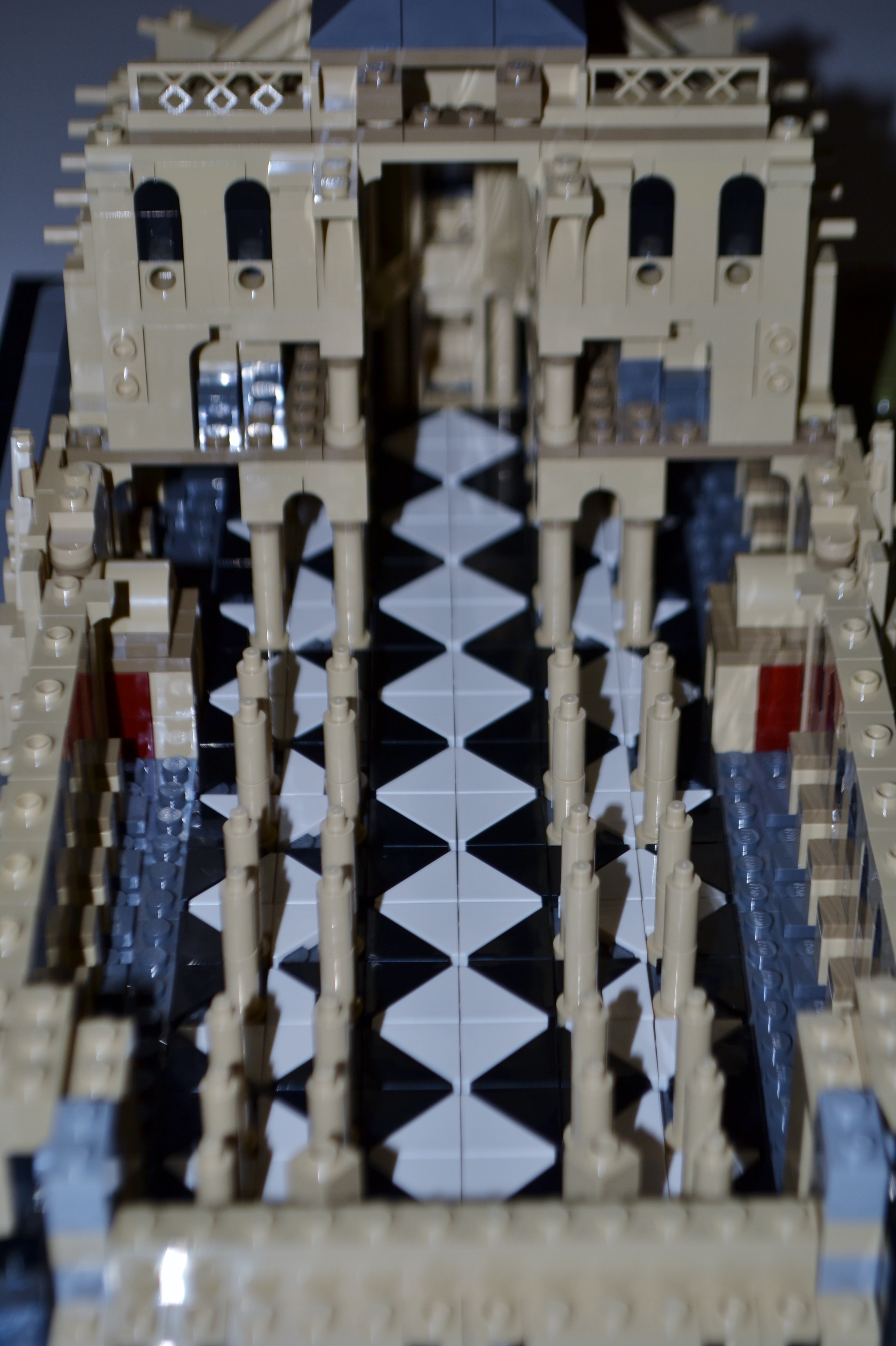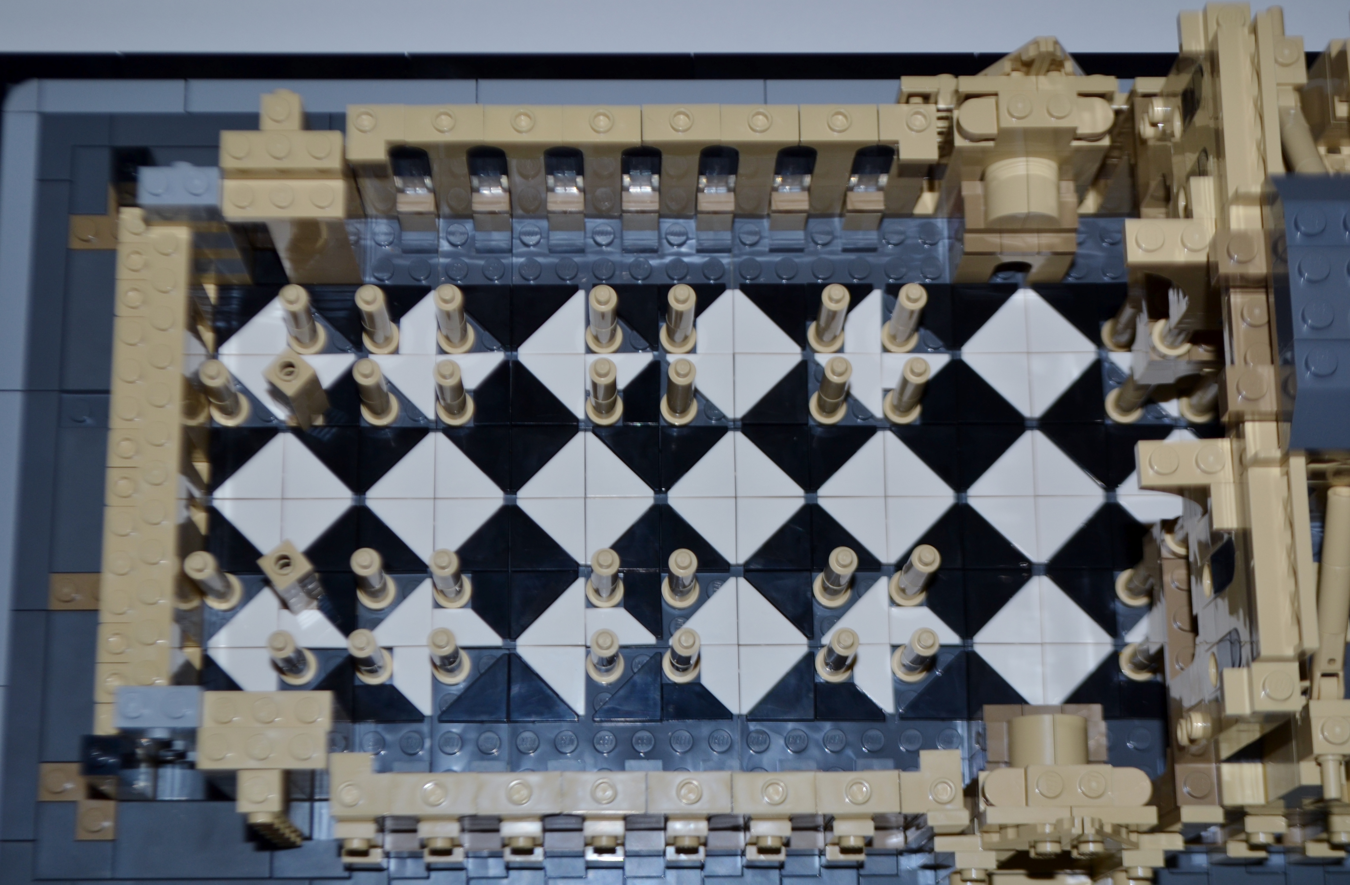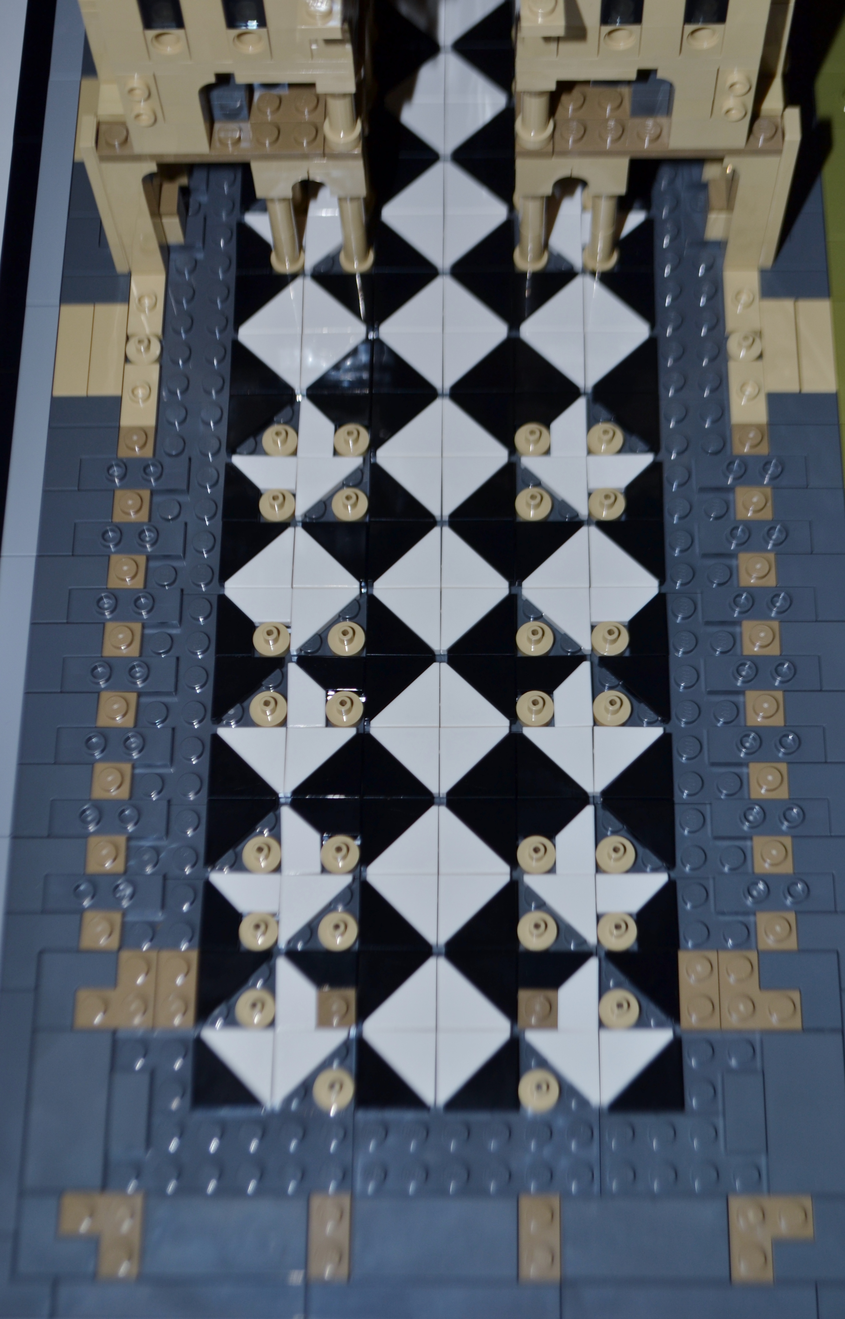 On peut enlever facilement la toiture afin de découvrir le dallage en damier. C'est le seul point négatif de cette construction c'est justement ce sol en damier. Je trouve que les carrés sont trop gros. Par la suite je changerai et je mettrai des pièces de 1x1 noires et blanches.