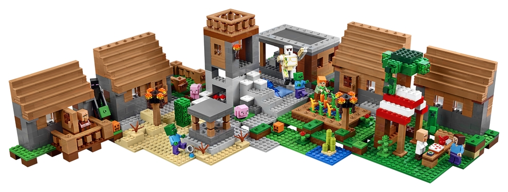 • Includes 4 minifigures: Steve, Alex, zombie and a zombie villager, plus a Creeper™, enderman, pig, baby pig, iron golem and 2 villagers (a farmer and a librarian).