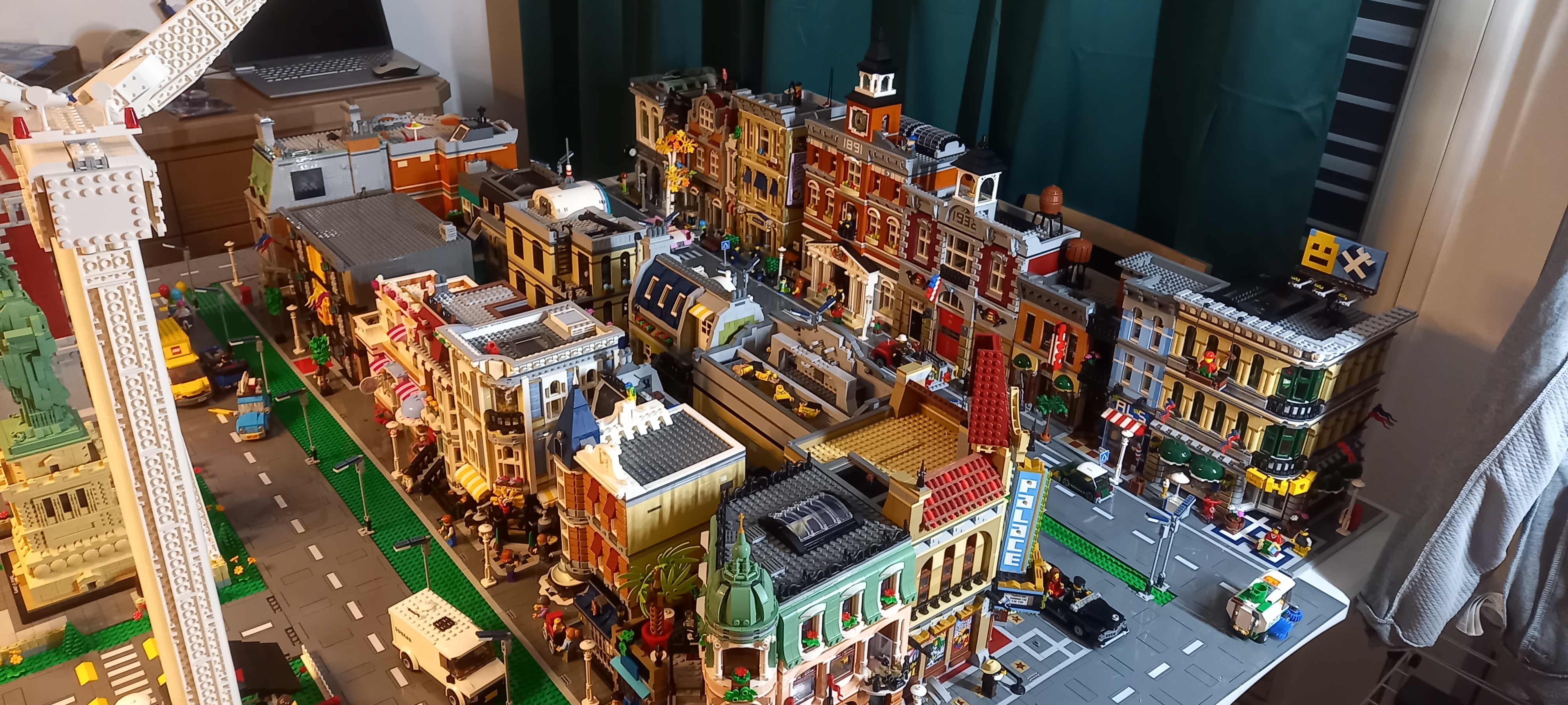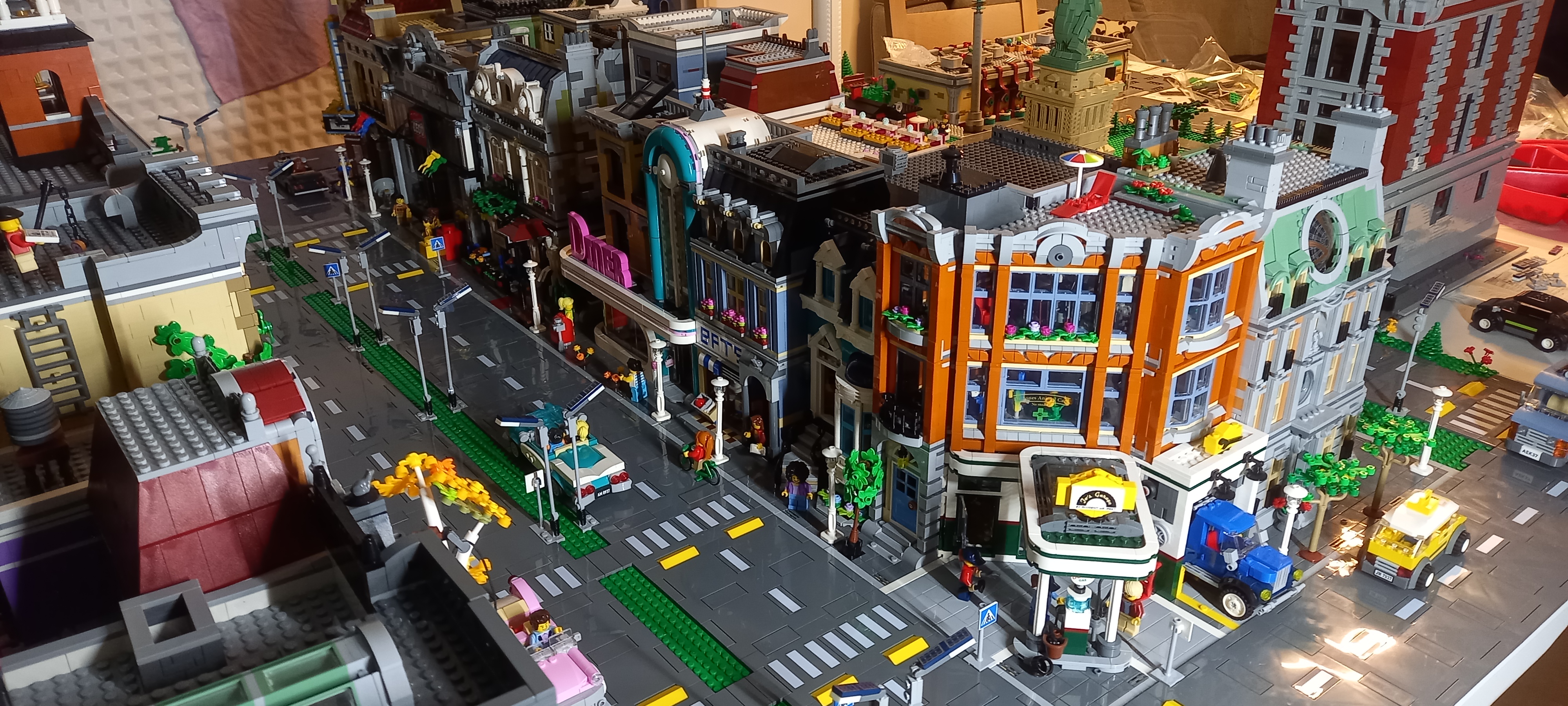 La mise en scène du Lego modular 2022 à complétement changé avec l'arrivé de mon Papa qui a eu plein d'idée et surtout voulu faire quelques chose de plus imposant. Prit au jeu, j'ai suivi et maintenant, ça ressemble a ça